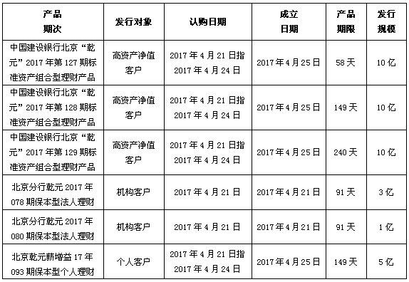 中国建设银行北京市分行定于2017年4月21日发行理财产品,现将相关发行情况公告如下: