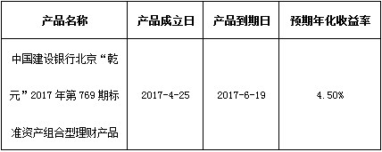 关于中国建设银行北京“乾元”2017年第769期标准资产组合型理财产品成立的公告