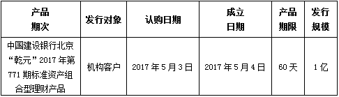 中国建设银行北京市分行定于2017年5月3日发行理财产品,现将相关发行情况公告如下: