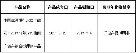 关于中国建设银行北京“乾元”2017年第775期标准资产组合型理财产品成立的公告