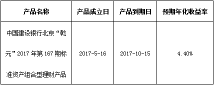 关于中国建设银行北京“乾元”2017年第167期标准资产组合型理财产品成立的公告