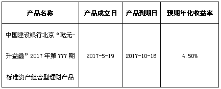 关于中国建设银行北京“乾元-升益鑫”2017年第777期标准资产组合型理财产品成立的公告