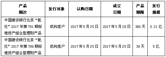 中国建设银行北京市分行定于2017年5月25日内发行理财产品,现将相关发行情况公告如下: