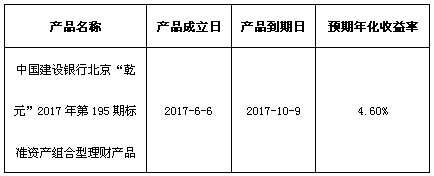 关于中国建设银行北京“乾元”2017年第195期标准资产组合型理财产品成立的公告