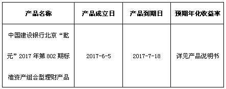 关于中国建设银行北京“乾元”2017年第802期标准资产组合型理财产品成立的公告