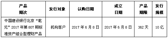 中国建设银行北京市分行定于2017年6月8日发行理财产品,现将相关发行情况公告如下: