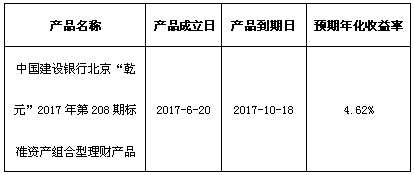 关于中国建设银行北京“乾元”2017年第208期标准资产组合型理财产品成立的公告