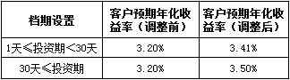 新客户预期年化收益率于2017年8月2日(含)起执行。对于2017年8月2日(不含)前已经购买成功且未赎回的所有存量客户投资本金,按照客户实际持有天数,其中2017年8月2日(不含)前持有部分执行原客户预期年化收益率,2017年8月2日(含)后持有部分自动执行新客户预期年化收益率,但以最终支付的实际年化收益率为准。