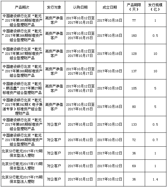 中国建设银行北京市分行定于2017年10月12日发行理财产品,现将相关发行情况公告如下: