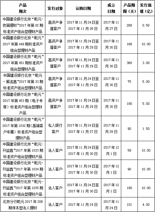 中国建设银行北京市分行定于2017年11月24日发行理财产品,现将相关发行情况公告如下: