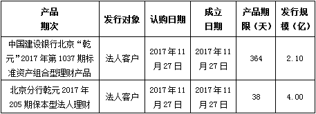 中国建设银行北京市分行定于2017年11月27日发行理财产品,现将相关发行情况公告如下: