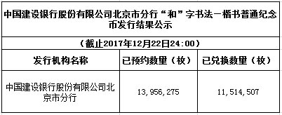 中国建设银行股份有限公司北京市分行“和”字书法—楷书普通纪念币发行进度公示