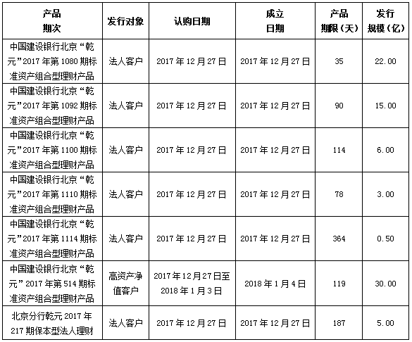 中国建设银行北京市分行定于2017年12月27日发行理财产品,现将相关发行情况公告如下: