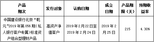 中国建设银行北京市分行定于2019年2月22日发行理财产品,现将相关发行情况公告如下: