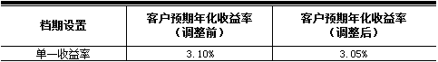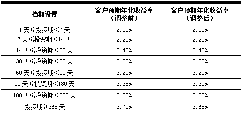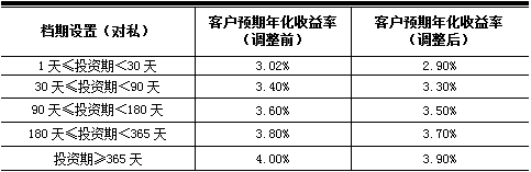 新客户预期年化收益率于2019年4月12日(含)起执行。对于2019年4月12日(不含)前已经购买成功且未赎回的所有存量客户投资本金,按照客户实际持有天数,其中2019年4月12日(不含)前持有部分执行原客户预期年化收益率,2019年4月12日(含)后持有部分自动执行新客户预期年化收益率,但以最终支付的实际年化收益率为准。
