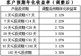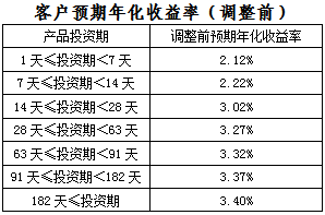 上述调整后的客户预期年化收益率拟于2019年4月17日(含)开始执行。对于2019年4月17日前已经申购成功且未赎回的所有存量客户理财资金,2019年4月17日前执行原有客户预期年化收益率标准,2019年4月17日(含)后执行调整后客户预期年化收益率标准。