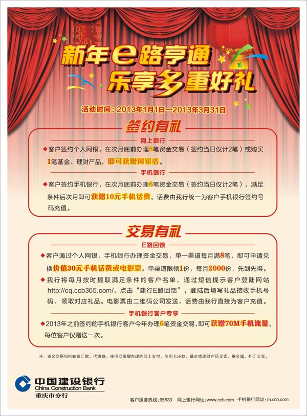 答:2013年1月1日—3月31日,建行重庆市分行针对个人电子银行客户开展多重好礼相送活动。