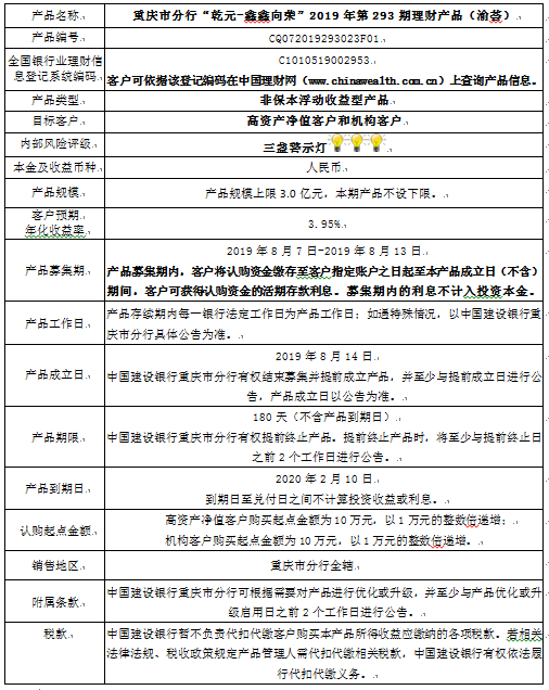 中国建设银行重庆市分行“乾元-鑫鑫向荣” 2019年第293期理财产品风险揭示书和说明书