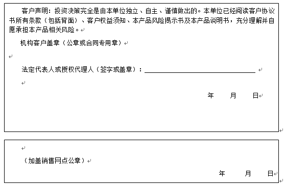 客户签名:                                    客户声明:投资决策完全是由客户独立、自主、谨慎做出的。客户已经阅读客户协议书所有条款(包括背面)、客户权益须知、本产品风险揭示书及本产品说明书,充分理解并自愿承担本产品相关风险。)