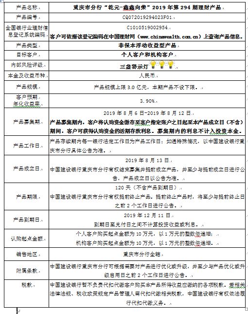中国建设银行重庆市分行“乾元-鑫鑫向荣” 2019年第294期理财产品风险揭示书和产品说明书