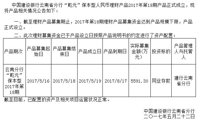 中国建设银行云南省分行“乾元”保本型人民币理财产品2017年第18期成立公告