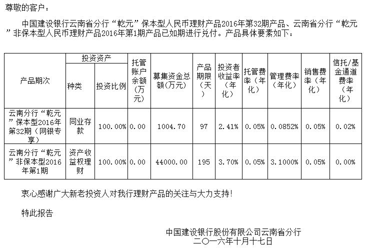 中国建设银行云南省分行“乾元”人民币理财产品清算报告