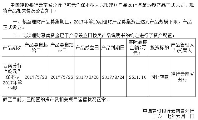中国建设银行云南省分行“乾元”保本型人民币理财产品2017年第19期成立公告