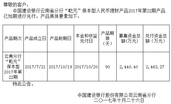 中国建设银行云南省分行“乾元”保本型人民币理财产品2017年22期兑付公告