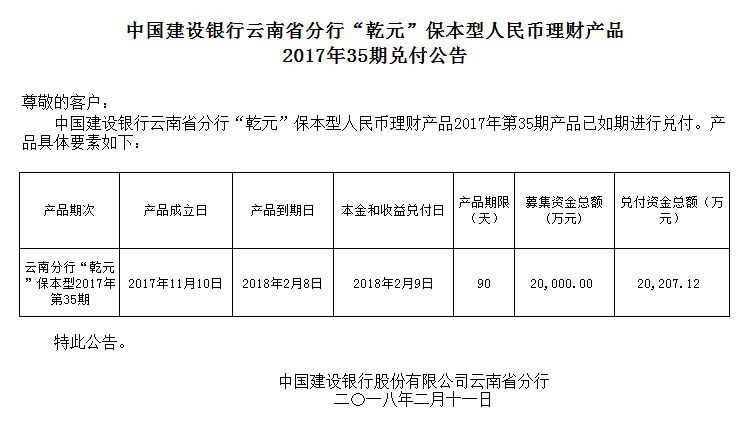 中国建设银行云南省分行“乾元”保本型人民币理财产品2017年35期兑付公告
