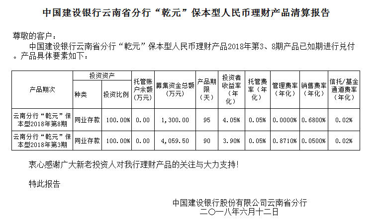 中国建设银行云南省分行“乾元”保本型人民币理财产品2018年3、8期清算报告