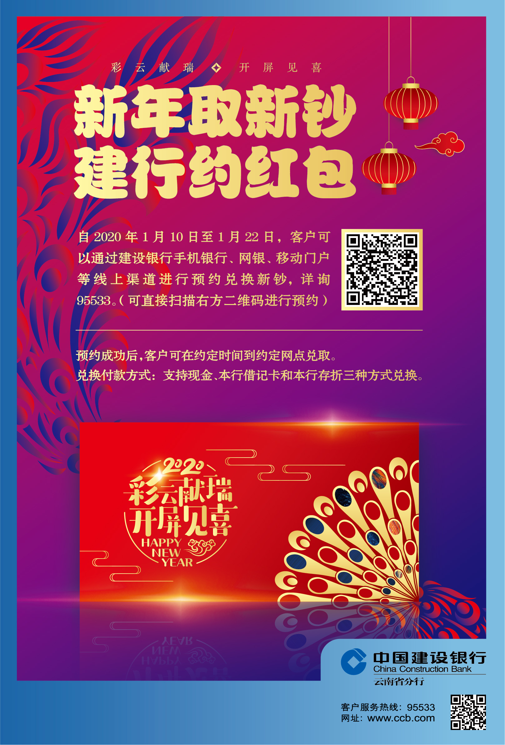 中国建设银行拟在2020年春节期间发行“现金红包”产品,即新钞预约兑换。我行客户可通过手机银行、个人网银、移动门户,以及我行网点进行预约兑换新钞,现将有关事项公告如下: